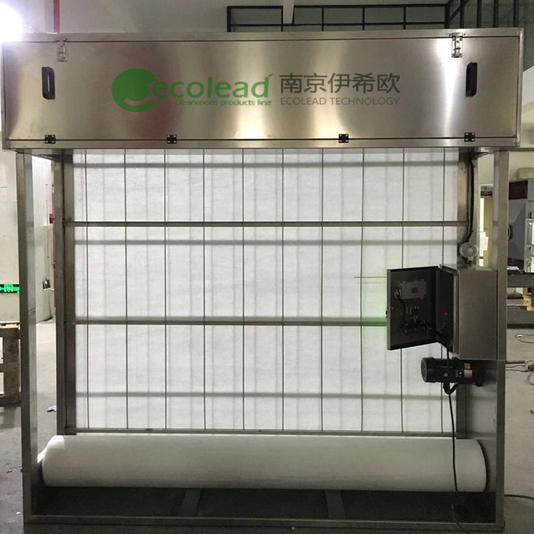自动卷绕式空气过滤器有一个立式的矩形框架,一个由电机齿轮箱驱动的可更换的滤布轴。滤布在非碾压的状态下逐渐从框架的顶部跨过整个框架到框架的底部,在空气通过滤布时将其中的灰尘滤下来,每台空气过滤器提供现场控制柜。